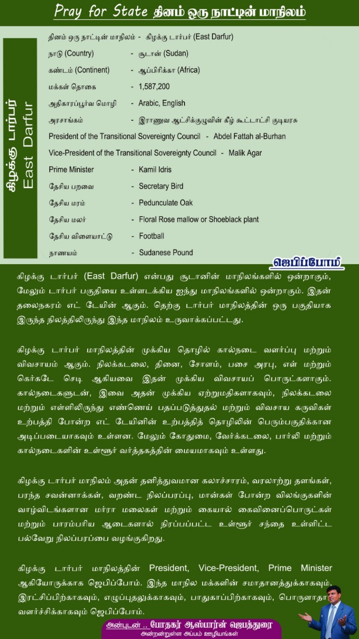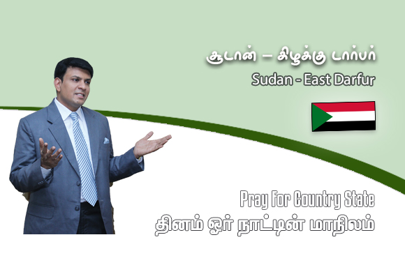 கிழக்கு டார்பர் மாநிலத்தின் President, Vice-President, Prime Minister ஆகியோருக்காக ஜெபிப்போம். இந்த மாநில மக்களின் சமாதானத்துக்காகவும், இரட்சிப்பிற்காகவும், எழுப்புதலுக்காகவும், பாதுகாப்பிற்காகவும், பொருளாதார வளர்ச்சிக்காகவும் ஜெபிப்போம்.