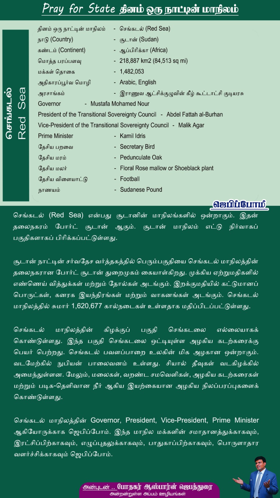 செங்கடல் மாநிலத்தின் Governor, President, Vice-President, Prime Minister ஆகியோருக்காக ஜெபிப்போம். இந்த மாநில மக்களின் சமாதானத்துக்காகவும், இரட்சிப்பிற்காகவும், எழுப்புதலுக்காகவும், பாதுகாப்பிற்காகவும், பொருளாதார வளர்ச்சிக்காகவும் ஜெபிப்போம்.