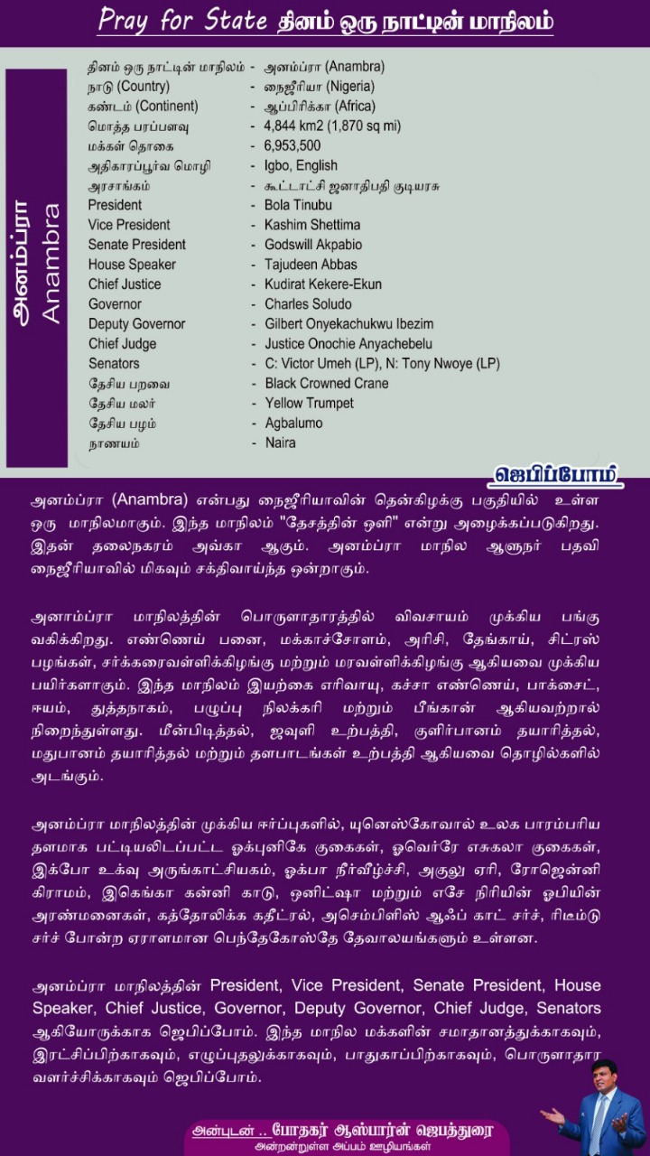 அனம்ப்ரா மாநிலத்தின் President, Vice President, Senate President, House Speaker, Chief Justice, Governor, Deputy Governor, Chief Judge, Senators ஆகியோருக்காக ஜெபிப்போம். இந்த மாநில மக்களின் சமாதானத்துக்காகவும், இரட்சிப்பிற்காகவும், எழுப்புதலுக்காகவும், பாதுகாப்பிற்காகவும், பொருளாதார  வளர்ச்சிக்காகவும் ஜெபிப்போம்.