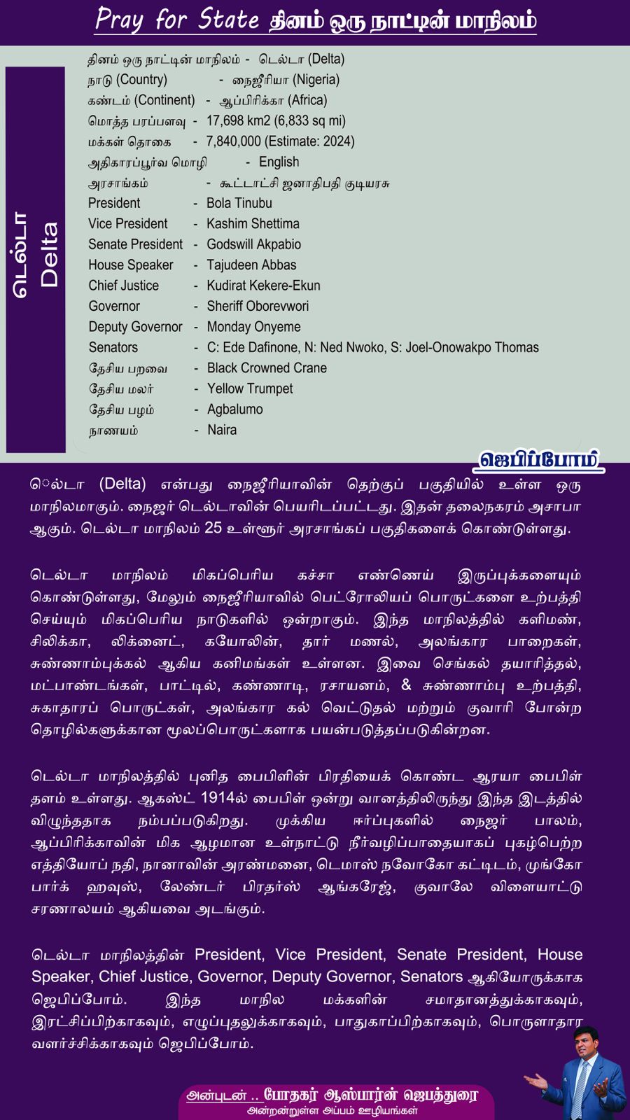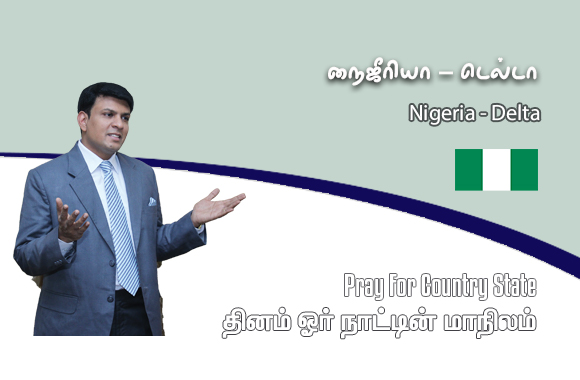 டெல்டா மாநிலத்தின் President, Vice President, Senate President, House Speaker, Chief Justice, Governor, Deputy Governor, Senators ஆகியோருக்காக ஜெபிப்போம். இந்த மாநில மக்களின் சமாதானத்துக்காகவும், இரட்சிப்பிற்காகவும், எழுப்புதலுக்காகவும், பாதுகாப்பிற்காகவும், பொருளாதார வளர்ச்சிக்காகவும் ஜெபிப்போம்.