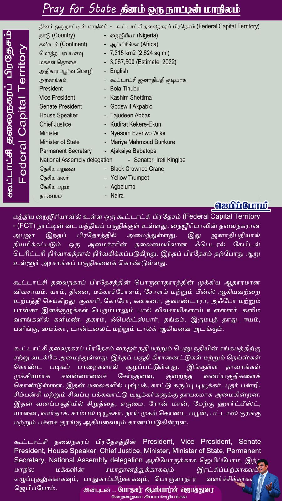 கூட்டாட்சி தலைநகரப் பிரதேசத்தின் President, Vice President, Senate President, House Speaker, Chief Justice, Minister, Minister of State, Permanent Secretary, National Assembly delegation ஆகியோருக்காக ஜெபிப்போம். இந்த மாநில மக்களின் சமாதானத்துக்காகவும், இரட்சிப்பிற்காகவும், எழுப்புதலுக்காகவும், பாதுகாப்பிற்காகவும், பொருளாதார வளர்ச்சிக்காகவும் ஜெபிப்போம்.