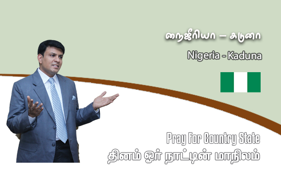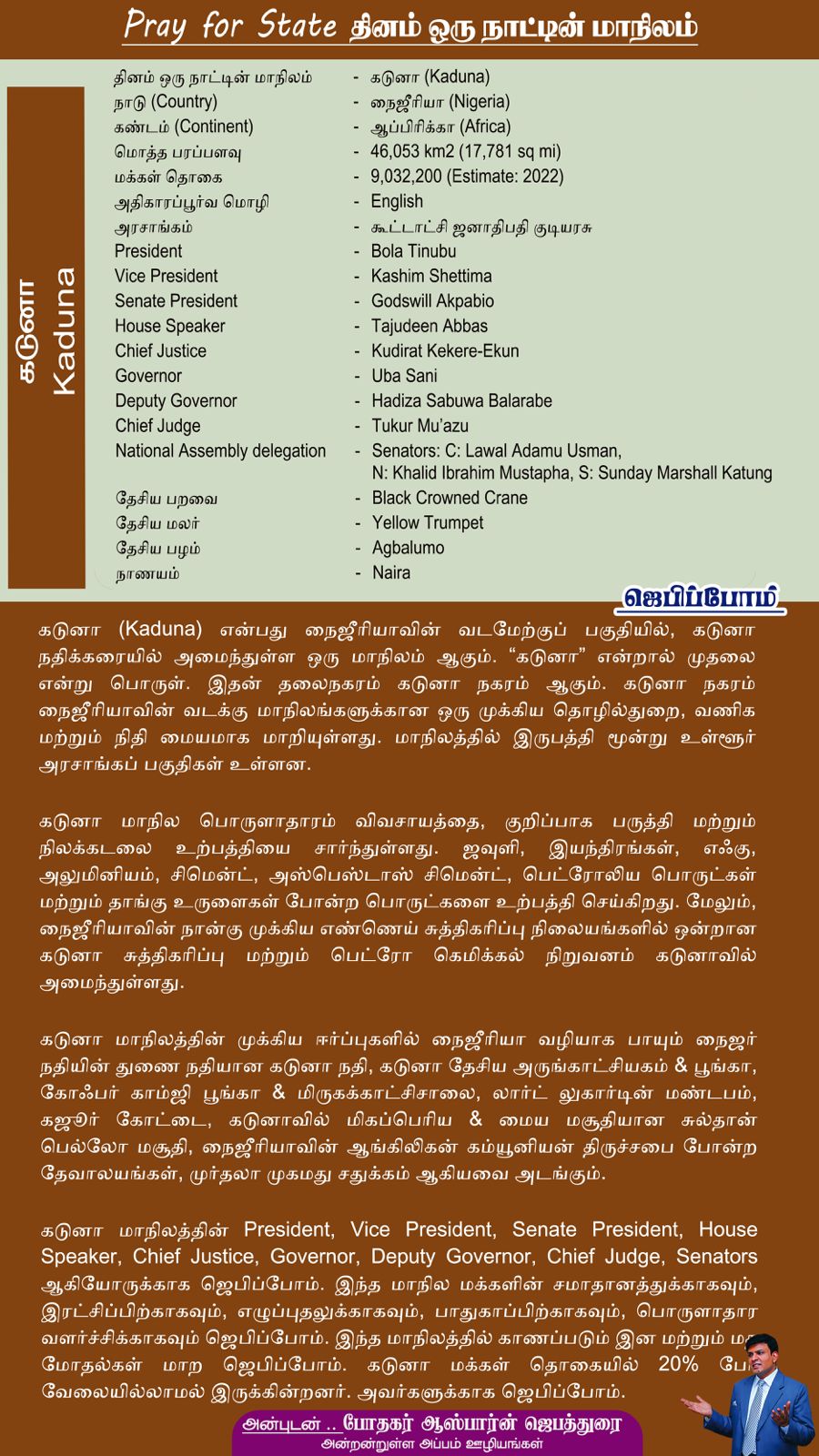 கடுனா மாநிலத்தின் President, Vice President, Senate President, House Speaker, Chief Justice, Governor, Deputy Governor, Chief Judge, Senators ஆகியோருக்காக ஜெபிப்போம். இந்த மாநில மக்களின் சமாதானத்துக்காகவும், இரட்சிப்பிற்காகவும், எழுப்புதலுக்காகவும், பாதுகாப்பிற்காகவும், பொருளாதார வளர்ச்சிக்காகவும் ஜெபிப்போம். இந்த மாநிலத்தில் காணப்படும் இன மற்றும் மத மோதல்கள் மாற ஜெபிப்போம். கடுனா மக்கள் தொகையில் 20% பேர் வேலையில்லாமல் இருக்கின்றனர். அவர்களுக்காக ஜெபிப்போம்.