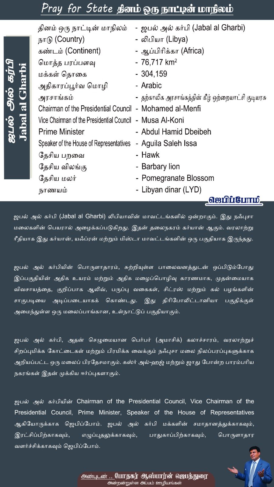 ஜபல் அல் கர்பியின் Chairman of the Presidential Council, Vice Chairman of the Presidential Council, Prime Minister, Speaker of the House of Representatives ஆகியோருக்காக ஜெபிப்போம். ஜபல் அல் கர்பி மக்களின் சமாதானத்துக்காகவும், இரட்சிப்பிற்காகவும், எழுப்புதலுக்காகவும், பாதுகாப்பிற்காகவும், பொருளாதார வளர்ச்சிக்காகவும் ஜெபிப்போம்.