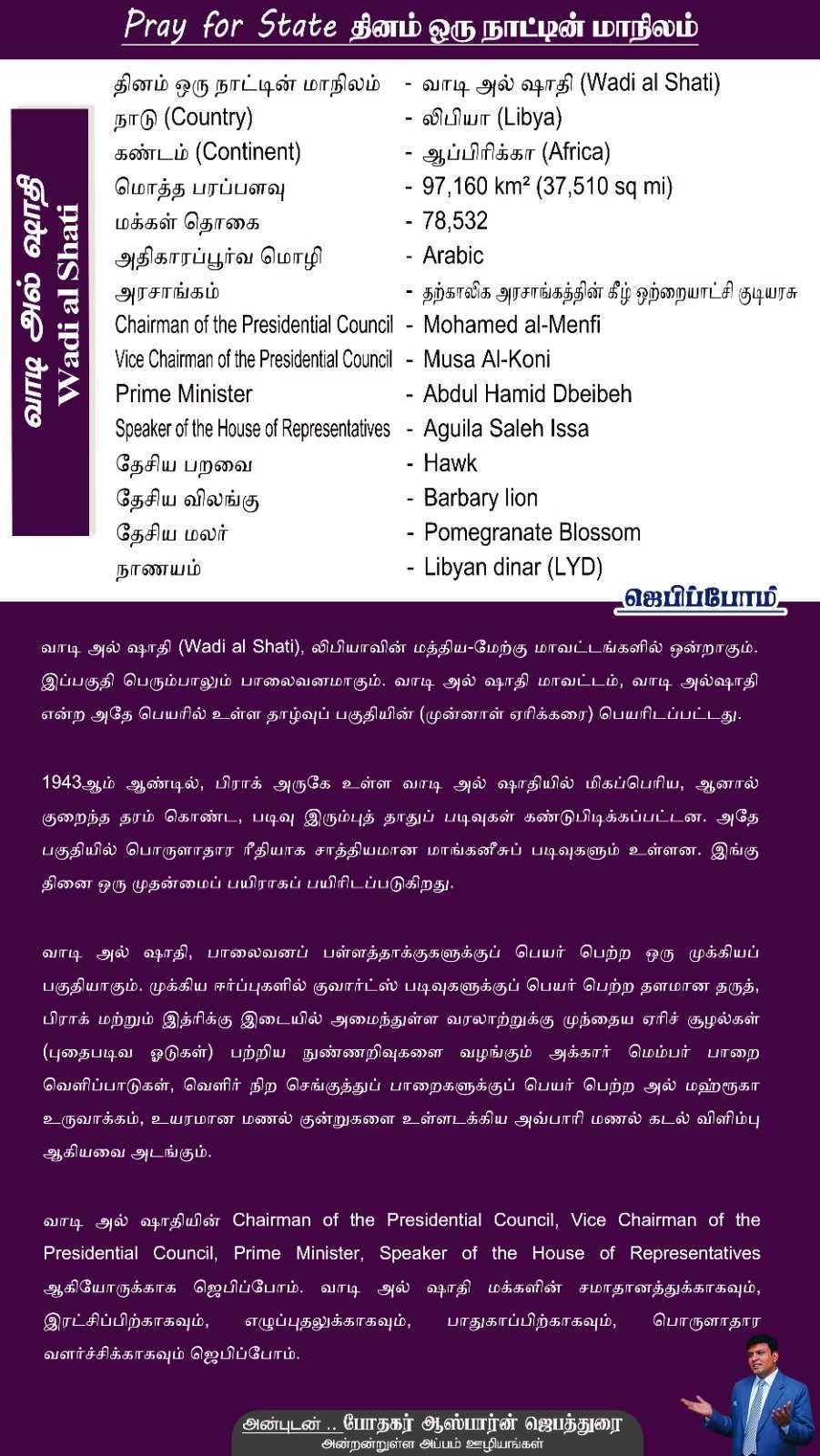 வாடி அல் ஷாதியின் Chairman of the Presidential Council, Vice Chairman of the Presidential Council, Prime Minister, Speaker of the House of Representatives ஆகியோருக்காக ஜெபிப்போம். வாடி அல் ஷாதி மக்களின் சமாதானத்துக்காகவும், இரட்சிப்பிற்காகவும், எழுப்புதலுக்காகவும், பாதுகாப்பிற்காகவும், பொருளாதார வளர்ச்சிக்காகவும் ஜெபிப்போம்.