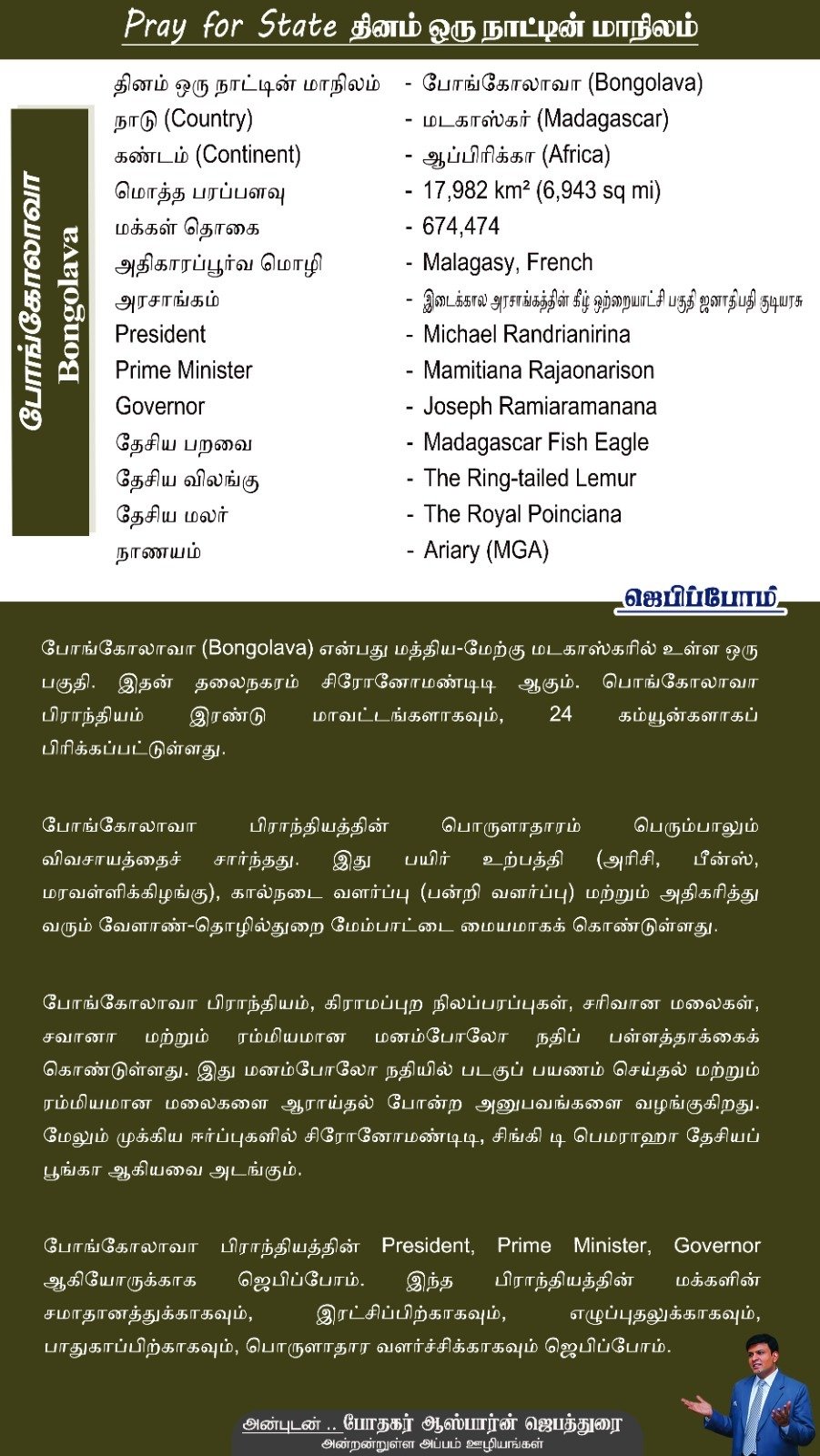 போங்கோலாவா பிராந்தியத்தின் President, Prime Minister, Governor ஆகியோருக்காக ஜெபிப்போம். இந்த பிராந்தியத்தின் மக்களின் சமாதானத்துக்காகவும், இரட்சிப்பிற்காகவும், எழுப்புதலுக்காகவும், பாதுகாப்பிற்காகவும், பொருளாதார வளர்ச்சிக்காகவும் ஜெபிப்போம்.