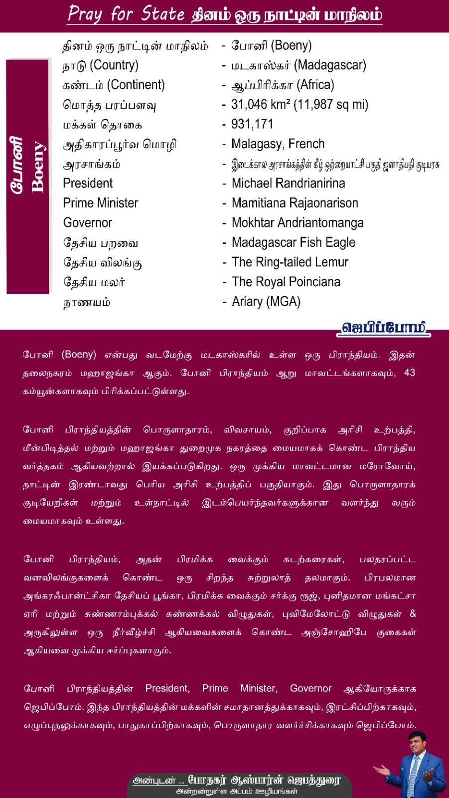 போனி பிராந்தியத்தின் President, Prime Minister, Governor ஆகியோருக்காக ஜெபிப்போம். இந்த பிராந்தியத்தின் மக்களின் சமாதானத்துக்காகவும், இரட்சிப்பிற்காகவும், எழுப்புதலுக்காகவும், பாதுகாப்பிற்காகவும், பொருளாதார வளர்ச்சிக்காகவும் ஜெபிப்போம்.