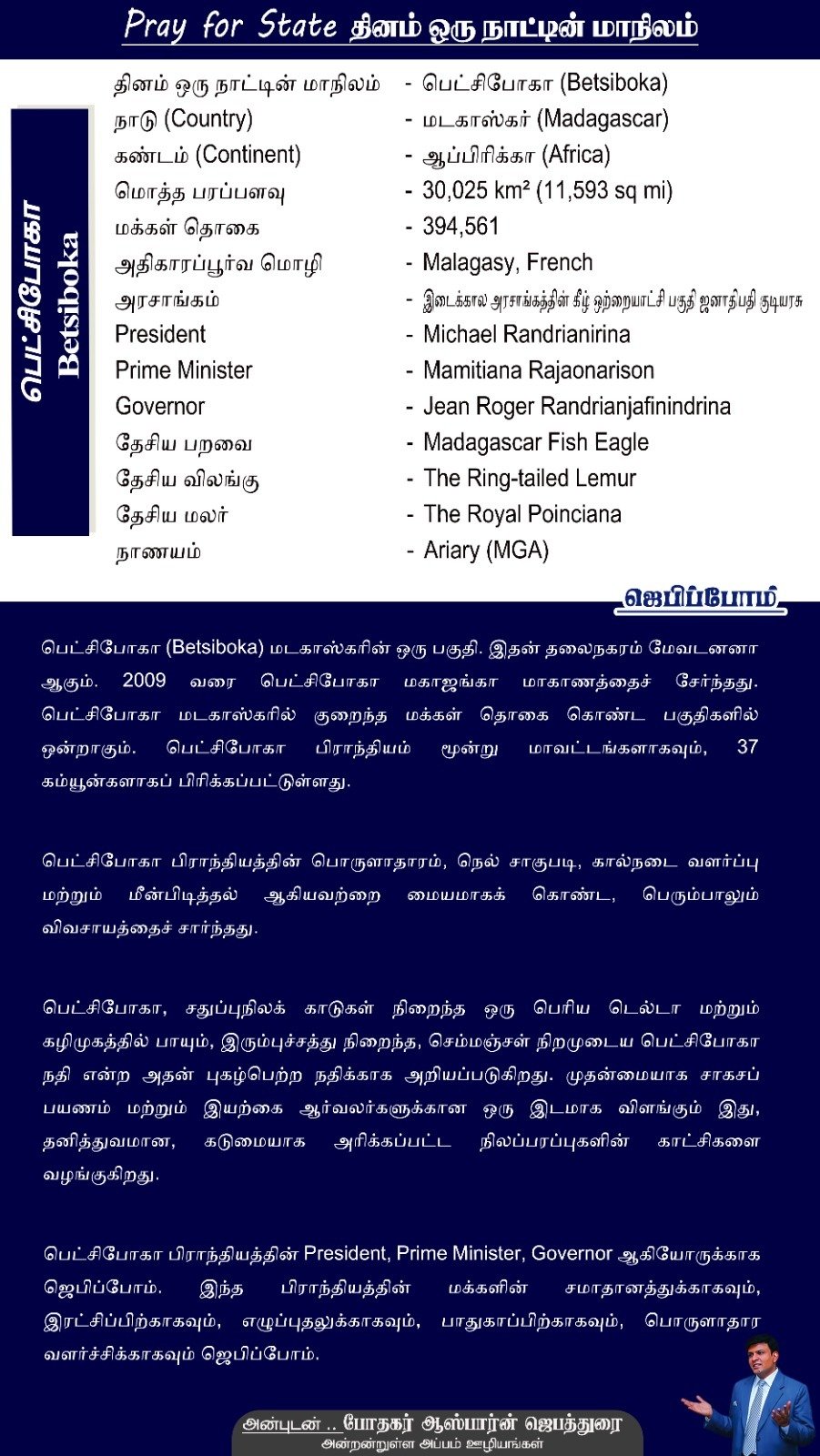 பெட்சிபோகா பிராந்தியத்தின் President, Prime Minister, Governor ஆகியோருக்காக ஜெபிப்போம். இந்த பிராந்தியத்தின் மக்களின் சமாதானத்துக்காகவும், இரட்சிப்பிற்காகவும், எழுப்புதலுக்காகவும், பாதுகாப்பிற்காகவும், பொருளாதார வளர்ச்சிக்காகவும் ஜெபிப்போம்.