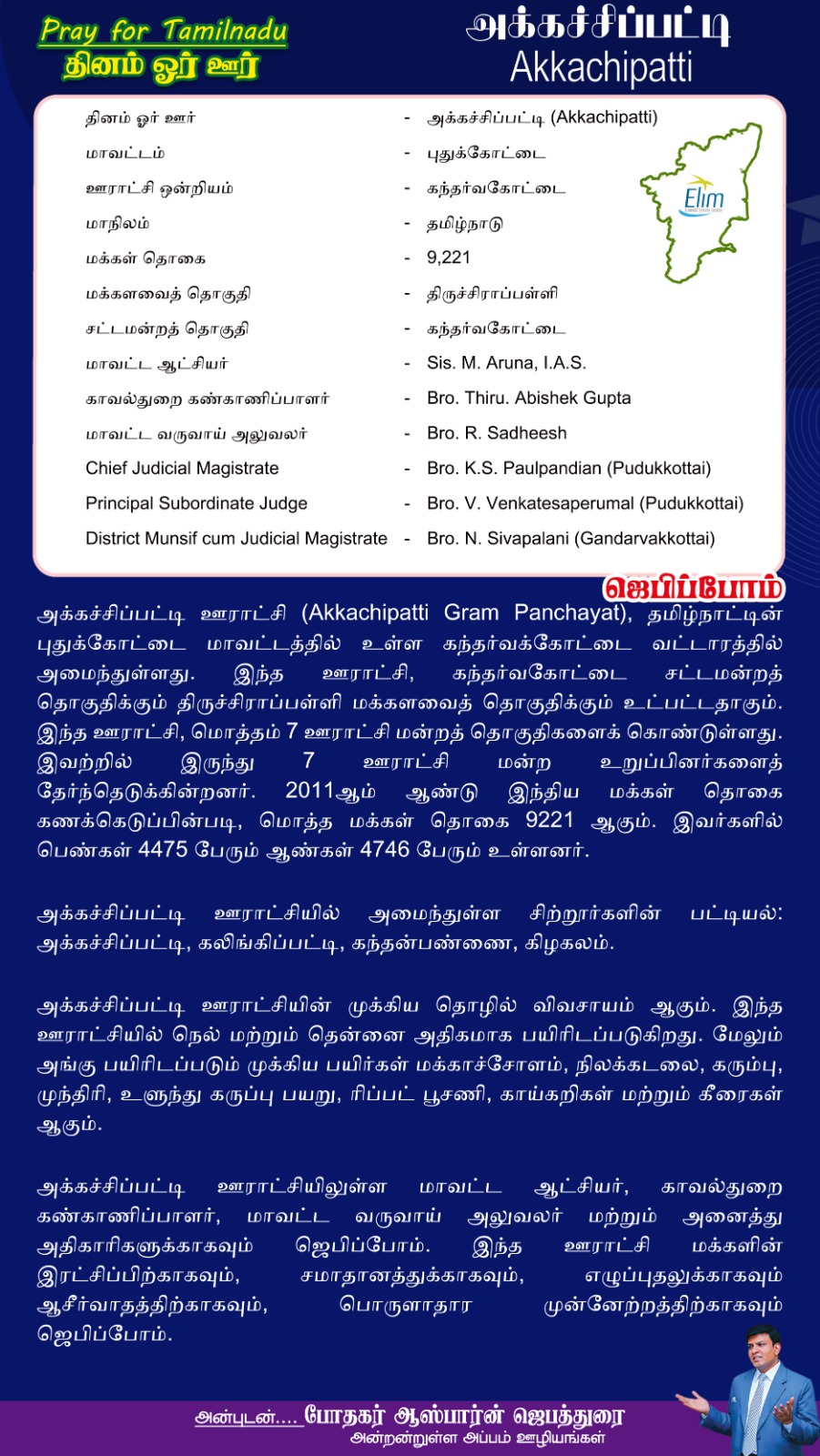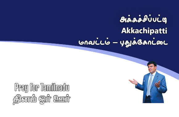 அக்கச்சிப்பட்டி ஊராட்சியிலுள்ள மாவட்ட ஆட்சியர், காவல்துறை கண்காணிப்பாளர், மாவட்ட வருவாய் அலுவலர் மற்றும் அனைத்து அதிகாரிகளுக்காகவும் ஜெபிப்போம். இந்த ஊராட்சி மக்களின் இரட்சிப்பிற்காகவும், சமாதானத்துக்காகவும், எழுப்புதலுக்காகவும் ஆசீர்வாதத்திற்காகவும், பொருளாதார முன்னேற்றத்திற்காகவும் ஜெபிப்போம்.