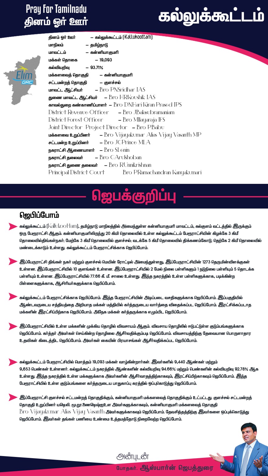 கல்லுக்கூட்டம் பேரூராட்சிக்காக ஜெபிப்போம். இந்த பேரூராட்சியின் அடிப்படை வசதிகளுக்காக ஜெபிப்போம். இப்பகுதியில் ஆண்டவருடைய சத்தியத்தை அறியாத மக்கள் மத்தியில் கர்த்தருடைய வார்த்தை விதைக்கப்பட ஜெபிப்போம். இரட்சிக்கப்படாத மக்களின் இரட்சிப்பிற்காக ஜெபிப்போம். அநேக மக்கள் கர்த்தருக்காக எழும்பிட ஜெபிப்போம்.