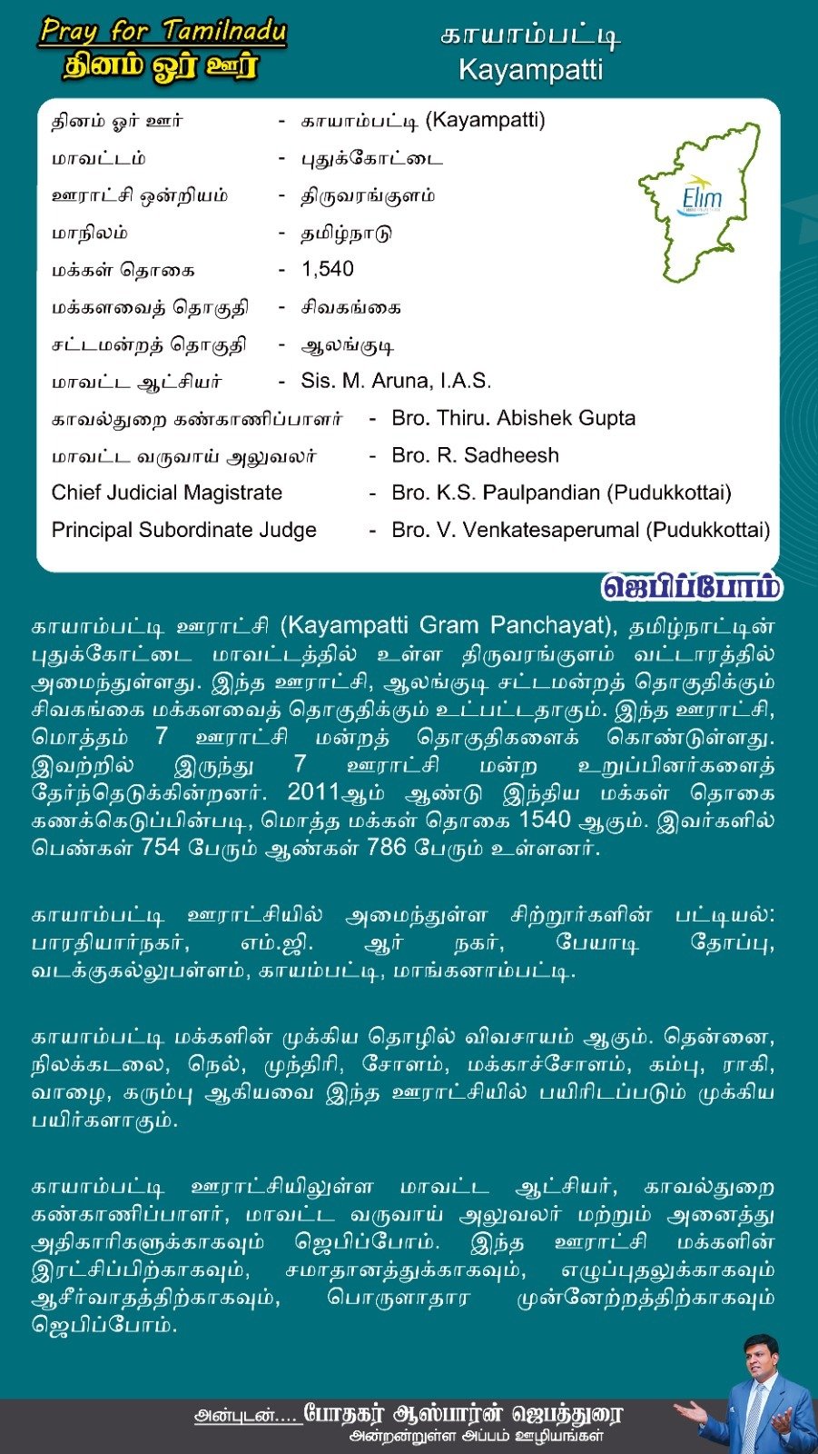 காயாம்பட்டி ஊராட்சியிலுள்ள மாவட்ட ஆட்சியர், காவல்துறை கண்காணிப்பாளர், மாவட்ட வருவாய் அலுவலர் மற்றும் அனைத்து அதிகாரிகளுக்காகவும் ஜெபிப்போம். இந்த ஊராட்சி மக்களின் இரட்சிப்பிற்காகவும், சமாதானத்துக்காகவும், எழுப்புதலுக்காகவும் ஆசீர்வாதத்திற்காகவும், பொருளாதார முன்னேற்றத்திற்காகவும் ஜெபிப்போம்.