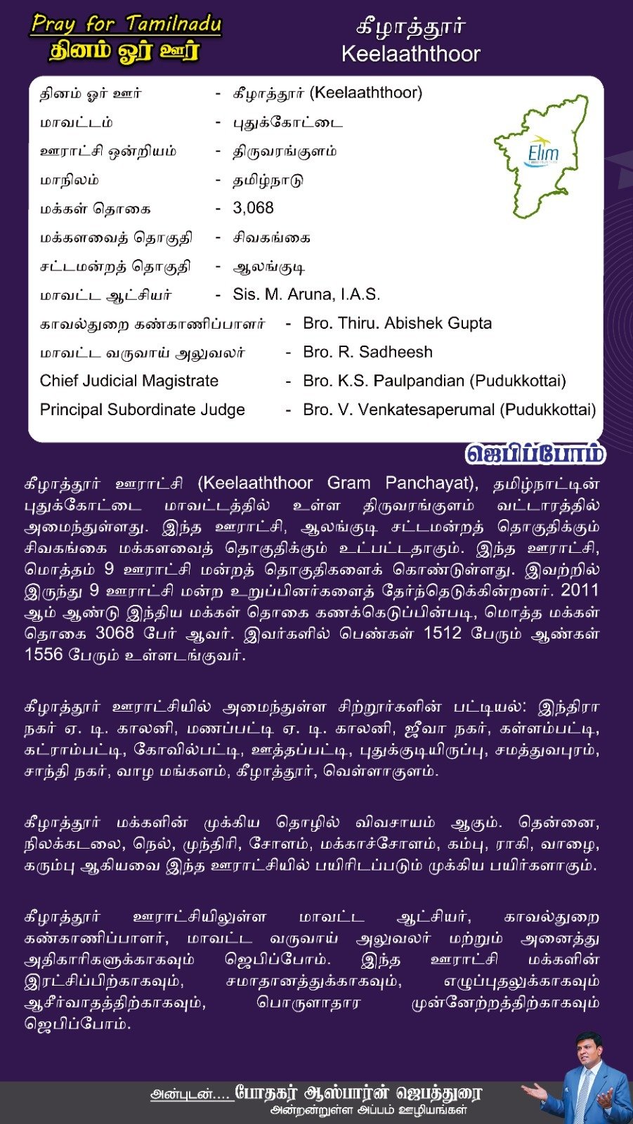 கீழாத்தூர் ஊராட்சியிலுள்ள மாவட்ட ஆட்சியர், காவல்துறை கண்காணிப்பாளர், மாவட்ட வருவாய் அலுவலர் மற்றும் அனைத்து அதிகாரிகளுக்காகவும் ஜெபிப்போம். இந்த ஊராட்சி மக்களின் இரட்சிப்பிற்காகவும், சமாதானத்துக்காகவும், எழுப்புதலுக்காகவும் ஆசீர்வாதத்திற்காகவும், பொருளாதார முன்னேற்றத்திற்காகவும் ஜெபிப்போம்.