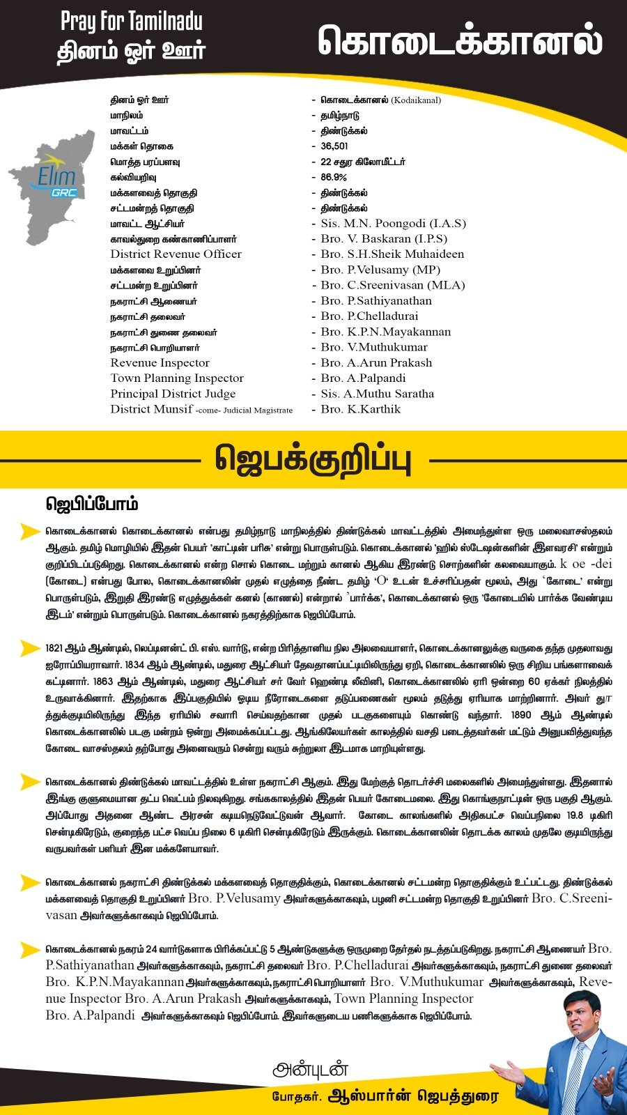 கொடைக்கானல் நகரம் 24 வார்டுகளாக பிரிக்கப்பட்டு 5 ஆண்டுகளுக்கு ஒருமுறை தேர்தல் நடத்தப்படுகிறது. நகராட்சி ஆணையர் Bro. P.Sathiyanathan அவர்களுக்காகவும், நகராட்சி தலைவர் Bro. P.Chelladurai அவர்களுக்காகவும், நகராட்சி துணை தலைவர் Bro. K.P.N.Mayakannan அவர்களுக்காகவும், நகராட்சி பொறியாளர் Bro. V.Muthukumar அவர்களுக்காகவும், Revenue Inspector Bro. A.Arun Prakash அவர்களுக்காகவும், Town Planning Inspector Bro. A.Palpandi அவர்களுக்காகவும் ஜெபிப்போம். இவர்களுடைய பணிகளுக்காக ஜெபிப்போம்.
