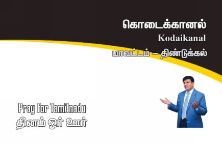 கொடைக்கானல் கொடைக்கானல் என்பது தமிழ்நாடு மாநிலத்தில் திண்டுக்கல் மாவட்டத்தில் அமைந்துள்ள ஒரு மலைவாசஸ்தலம் ஆகும். தமிழ் மொழியில் இதன் பெயர் “காட்டின் பரிசு” என்று பொருள்படும். கொடைக்கானல் “ஹில் ஸ்டேஷன்களின் இளவரசி” என்றும் குறிப்பிடப்படுகிறது. கொடைக்கானல் என்ற சொல் கொடை மற்றும் கானல் ஆகிய இரண்டு சொற்களின் கலவையாகும். k oe -dei (கோடை) என்பது போல, கொடைக்கானலின் முதல் எழுத்தை நீண்ட தமிழ் ‘O’ உடன் உச்சரிப்பதன் மூலம், அது “கோடை” என்று பொருள்படும், இறுதி இரண்டு எழுத்துக்கள் கனல் (காணல்) என்றால் “பார்க்க”, கொடைக்கானல் ஒரு “கோடையில் பார்க்க வேண்டிய இடம்” என்றும் பொருள்படும். கொடைக்கானல் நகரத்திற்காக ஜெபிப்போம்.