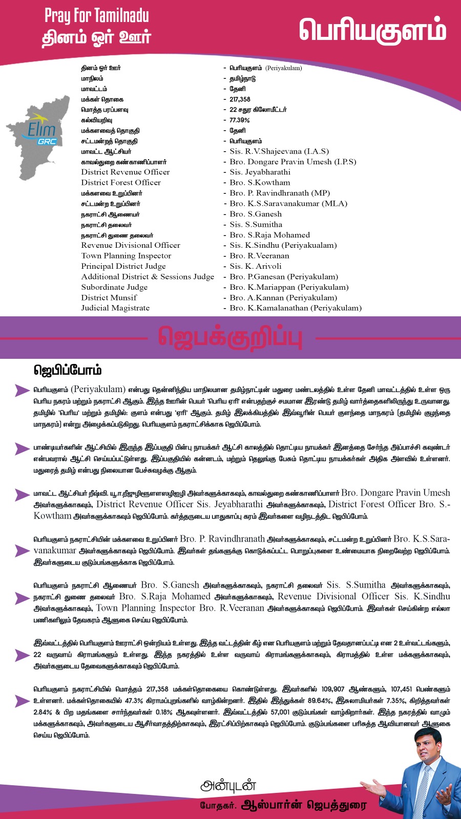 பெரியகுளம் நகராட்சிக்காக ஜெபிப்போம். பெரியகுளத்தில் உள்ள மக்களின் இரட்சிப்பிற்காக ஜெபிப்போம். கர்த்தர் பெரியகுளம் பகுதியில் பெரிய எழுப்புதலை கொண்டுவரும்படி ஜெபிப்போம். பெரியகுளம் நகரத்தில் சுவிசேஷம் அறிவிக்கப்படாத பகுதிகளில் கர்த்தருடைய வார்த்தை விதைக்கப்பட ஜெபிப்போம். பெரியகுளம் நகரத்தில் கர்த்தரால் அநேக ஆத்துமாக்கள் இரட்சிக்கப்படவும், அநேக தேவ ஊழியர்களையும் கர்த்தர் எழுப்பி தரும்படி ஜெபிப்போம்