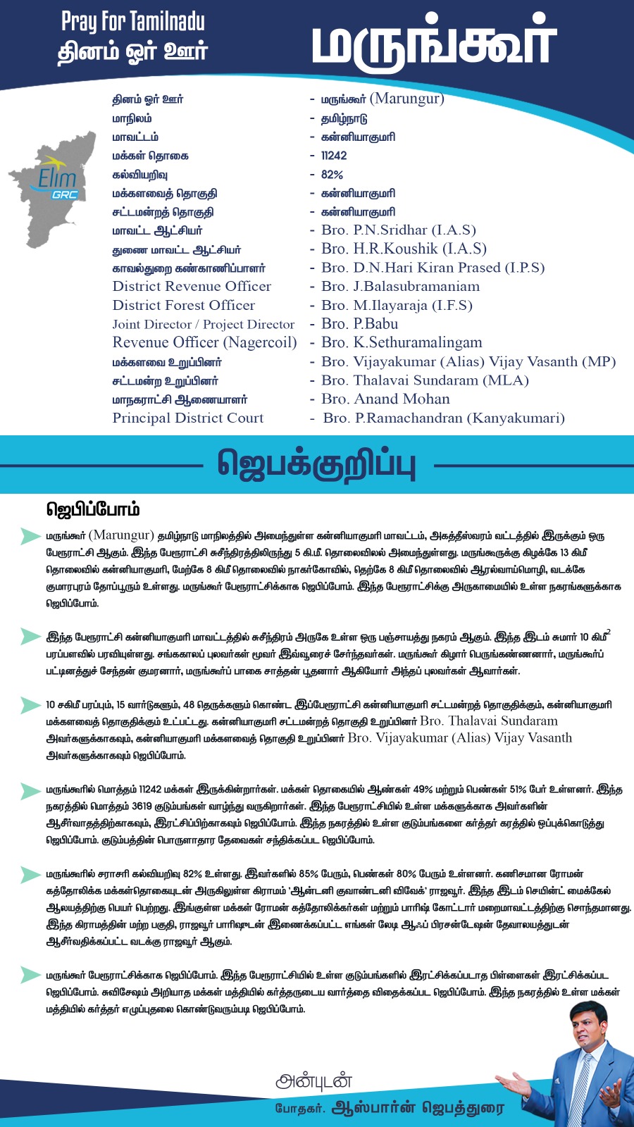 மருங்கூர் பேரூராட்சிக்காக ஜெபிப்போம். இந்த பேரூராட்சியில் உள்ள குடும்பங்களில் இரட்சிக்கப்படாத பிள்ளைகள் இரட்சிக்கப்பட ஜெபிப்போம். சுவிசேஷம் அறியாத மக்கள் மத்தியில் கர்த்தருடைய வார்த்தை விதைக்கப்பட ஜெபிப்போம். இந்த நகரத்தில் உள்ள மக்கள் மத்தியில் கர்த்தர் எழுப்புதலை கொண்டுவரும்படி ஜெபிப்போம்.