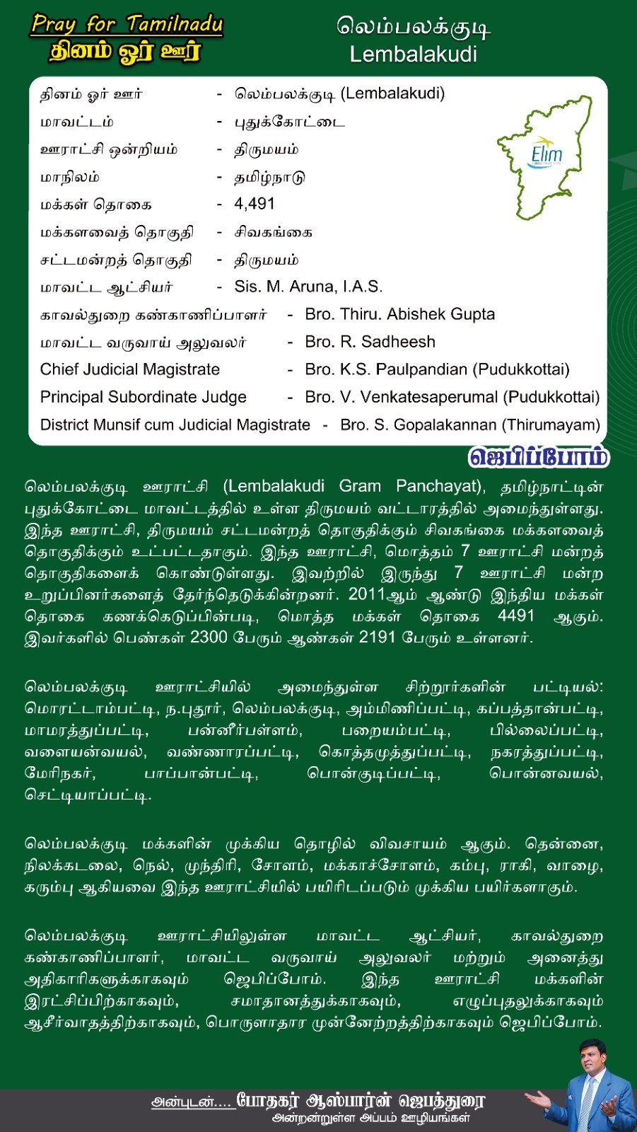 லெம்பலக்குடி ஊராட்சியிலுள்ள மாவட்ட ஆட்சியர், காவல்துறை கண்காணிப்பாளர், மாவட்ட வருவாய் அலுவலர் மற்றும் அனைத்து அதிகாரிகளுக்காகவும் ஜெபிப்போம். இந்த ஊராட்சி மக்களின் இரட்சிப்பிற்காகவும், சமாதானத்துக்காகவும், எழுப்புதலுக்காகவும் ஆசீர்வாதத்திற்காகவும், பொருளாதார முன்னேற்றத்திற்காகவும் ஜெபிப்போம்.