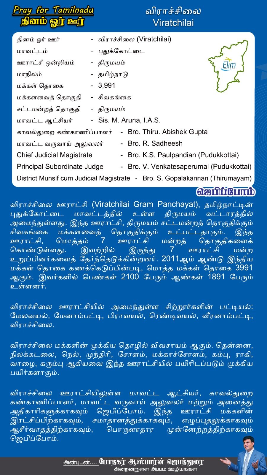 விராச்சிலை ஊராட்சியிலுள்ள மாவட்ட ஆட்சியர், காவல்துறை கண்காணிப்பாளர், மாவட்ட வருவாய் அலுவலர் மற்றும் அனைத்து அதிகாரிகளுக்காகவும் ஜெபிப்போம். இந்த ஊராட்சி மக்களின் இரட்சிப்பிற்காகவும், சமாதானத்துக்காகவும், எழுப்புதலுக்காகவும் ஆசீர்வாதத்திற்காகவும், பொருளாதார முன்னேற்றத்திற்காகவும் ஜெபிப்போம்.