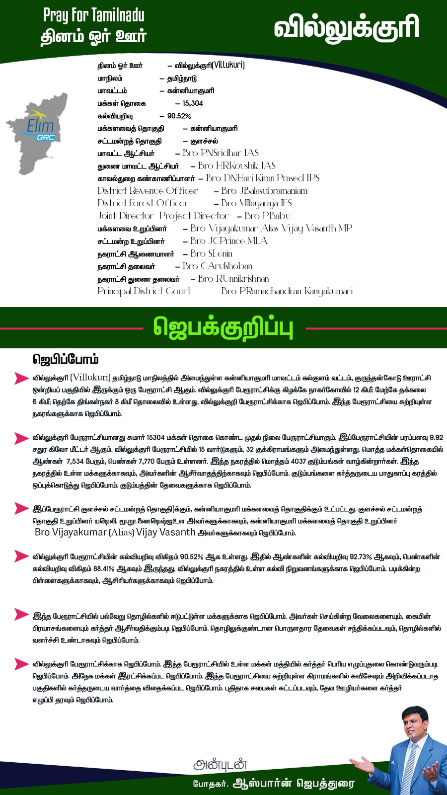 வில்லுக்குரி பேரூராட்சிக்காக ஜெபிப்போம். இந்த பேரூராட்சியில் உள்ள மக்கள் மத்தியில் கர்த்தர் பெரிய எழுப்புதலை கொண்டுவரும்படி ஜெபிப்போம். அநேக மக்கள் இரட்சிக்கப்பட ஜெபிப்போம். இந்த பேரூராட்சியை சுற்றியுள்ள கிராமங்களில் சுவிசேஷம் அறிவிக்கப்படாத பகுதிகளில் கர்த்தருடைய வார்த்தை விதைக்கப்பட ஜெபிப்போம். புதிதாக சபைகள் கட்டப்படவும், தேவ ஊழியர்களை கர்த்தர் எழுப்பி தரவும் ஜெபிப்போம்.