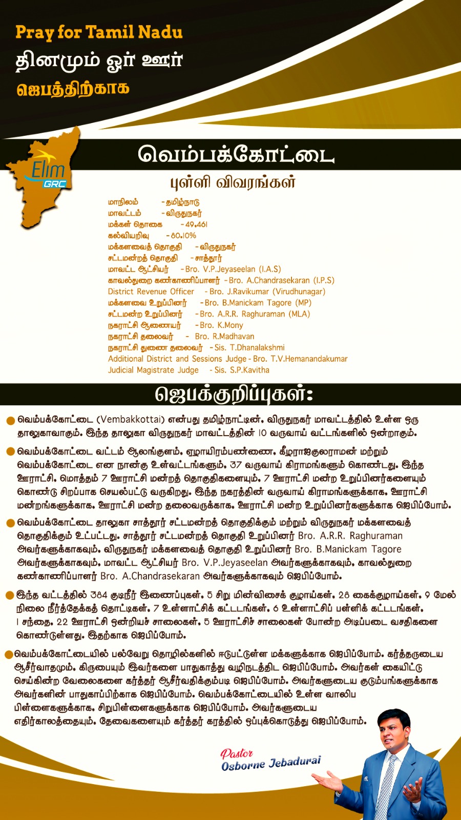 வெம்பக்கோட்டையில் பல்வேறு தொழில்களில் ஈடுபட்டுள்ள மக்களுக்காக ஜெபிப்போம். கர்த்தருடைய ஆசீர்வாதமும், கிருபையும் இவர்களை பாதுகாத்து வழிநடத்திட ஜெபிப்போம். அவர்கள் கையிட்டு செய்கின்ற வேலைகளை கர்த்தர் ஆசீர்வதிக்கும்படி ஜெபிப்போம். அவர்களுடைய குடும்பங்களுக்காக அவர்களின் பாதுகாப்பிற்காக ஜெபிப்போம். வெம்பக்கோட்டையில் உள்ள வாலிப பிள்ளைகளுக்காக, சிறுபிள்ளைகளுக்காக ஜெபிப்போம். அவர்களுடைய எதிர்காலத்தையும், தேவைகளையும் கர்த்தர் கரத்தில் ஒப்புக்கொடுத்து ஜெபிப்போம்.