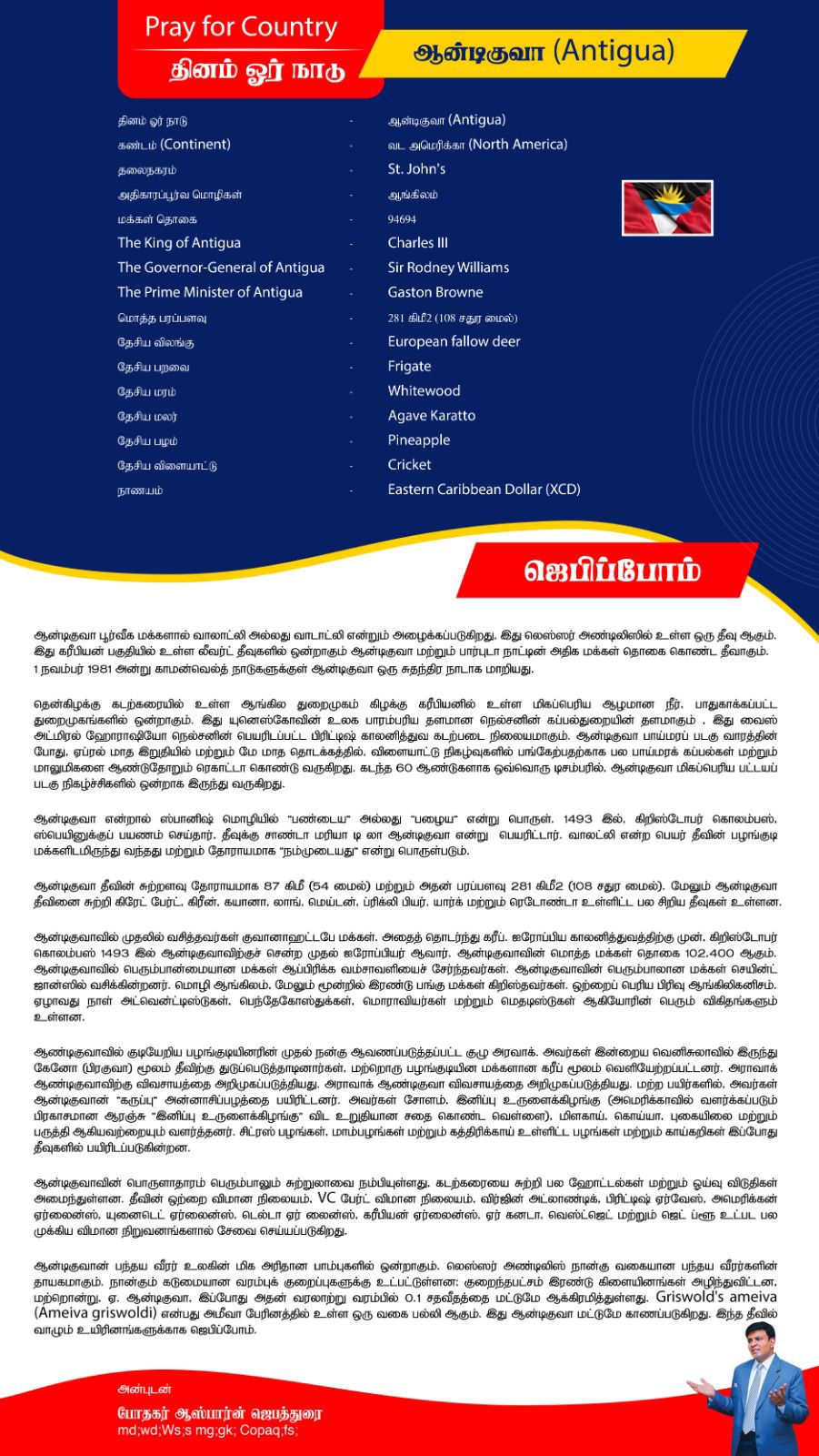 ஆன்டிகுவா நாட்டிற்காக ஜெபிப்போம். ஆன்டிகுவா நாட்டின் King Charles III அவர்களுக்காகவும், Governor-General Sir Rodney Williams அவர்களுக்காகவும், Prime Minister Gaston Browne அவர்களுக்காகவும் ஜெபிப்போம். ஆன்டிகுவா நாட்டு மக்களுக்காக ஜெபிப்போம். ஆன்டிகுவா நாட்டின் நிர்வாக பிரிவுகளுக்காகவும், அரசாங்கத்திற்காகவும் ஜெபிப்போம். நாட்டில் உள்ள வனவிலங்குகளுக்காகவும், இயற்கை வளங்களுக்காகவும் ஜெபிப்போம். நாட்டில் உள்ள தொழில் நிறுவனங்களுக்காக ஜெபிப்போம். நாட்டின் சுற்றுலா துறைக்காக ஜெபிப்போம். ஆன்டிகுவா நாட்டின் பொருளாதாரத்திற்காக ஜெபிப்போம்.