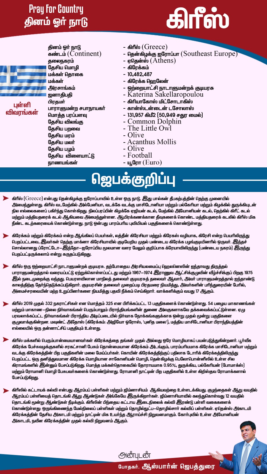 கிரீஸ் நாட்டிற்காக ஜெபிப்போம். கிரீஸ் நாட்டின் ஜனாதிபதி Katerina Sakellaropoulou அவர்களுக்காகவும், பிரதமர் கிரியாகோஸ் மிட்சோடாகிஸ் அவர்களுக்காகவும், பாராளுமன்ற சபாநாயகர் கான்ஸ்டன்டைன் டசோலாஸ் அவர்களுக்காகவும் ஜெபிப்போம். கிரீஸ் நாட்டு மக்களுக்காக அவர்களின் ஆசீர்வாதத்திற்காகவும், இரட்சிப்பிற்காகவும் ஜெபிப்போம். கிரீஸ் நாட்டில் உள்ள இயற்கை வளங்களுக்காகவும், அவைகள் பாதுகாக்கப்பட ஜெபிப்போம். நாட்டின் நிர்வாக பிரிவுகளுக்காகவும், அரசாங்கத்திற்காகவும் ஜெபிப்போம். கிரீஸ் நாட்டின் தொழில் வளர்ச்சிக்காகவும் ஜெபிப்போம். நாட்டின் பொருளாதாரத்திற்காக ஜெபிப்போம். கிரீஸ் நாட்டில் உள்ள கல்வி நிறுவனங்களுக்காக ஜெபிப்போம்.