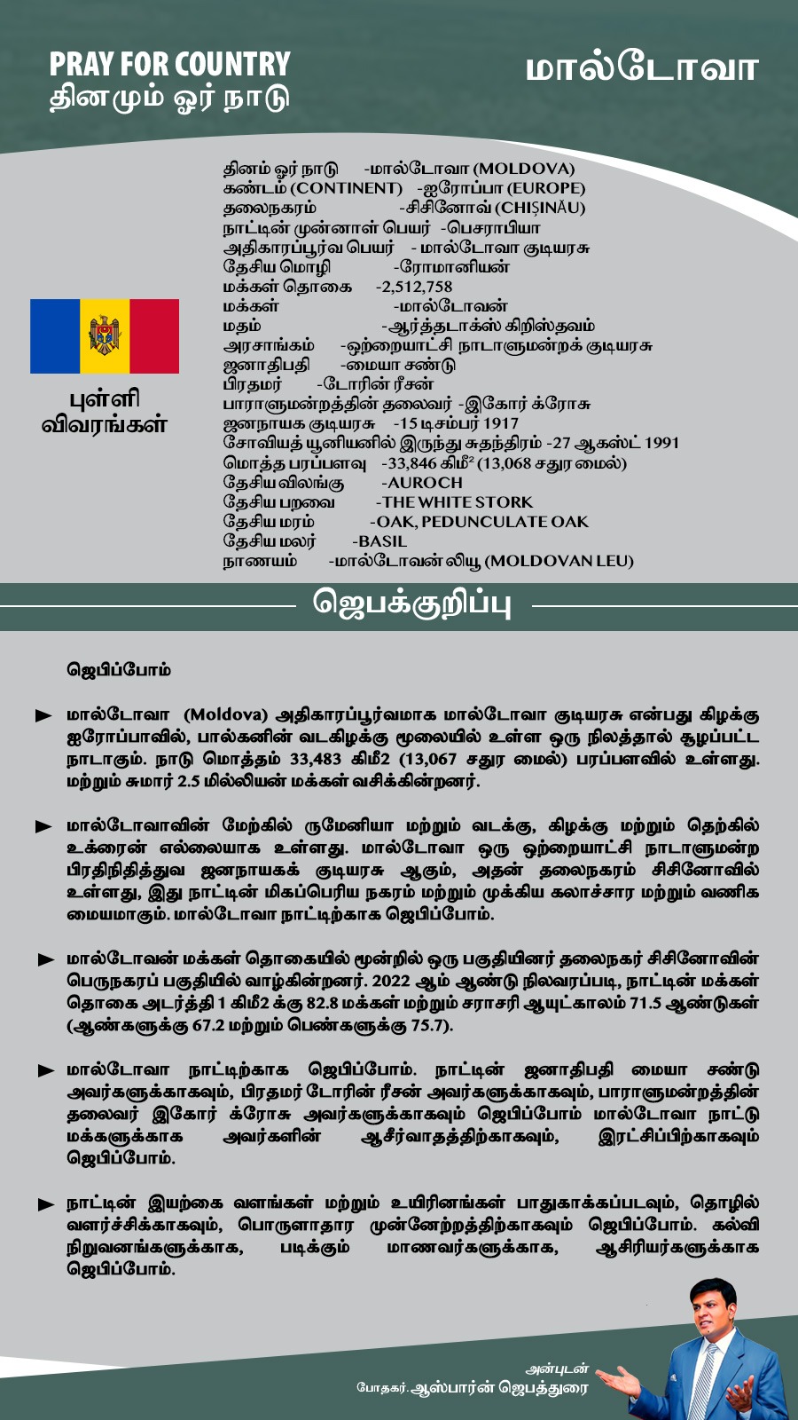 மால்டோவா  (Moldova) அதிகாரப்பூர்வமாக மால்டோவா குடியரசு என்பது கிழக்கு ஐரோப்பாவில், பால்கனின் வடகிழக்கு மூலையில் உள்ள ஒரு நிலத்தால் சூழப்பட்ட நாடாகும். நாடு மொத்தம் 33,483 கிமீ2 (13,067 சதுர மைல்) பரப்பளவில் உள்ளது. மற்றும் சுமார் 2.5 மில்லியன் மக்கள் வசிக்கின்றனர். மால்டோவாவின் மேற்கில் ருமேனியா மற்றும் வடக்கு, கிழக்கு மற்றும் தெற்கில் உக்ரைன் எல்லையாக உள்ளது. மால்டோவா ஒரு ஒற்றையாட்சி நாடாளுமன்ற பிரதிநிதித்துவ ஜனநாயகக் குடியரசு ஆகும், அதன் தலைநகரம் சிசினோவில் உள்ளது, இது நாட்டின் மிகப்பெரிய நகரம் மற்றும் முக்கிய கலாச்சார மற்றும் வணிக மையமாகும். மால்டோவா நாட்டிற்காக ஜெபிப்போம்.