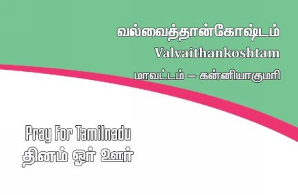 வல்வைத்தான்கோஷ்டம் பேரூராட்சியின் நகராட்சி ஆணையர் Bro. S.Lenin அவர்களுக்காகவும், நகராட்சி தலைவர் Bro. G.Arulshoban அவர்களுக்காகவும், நகராட்சி துணை தலைவர் Bro. R.Unnikrishnan அவர்களுக்காகவும் ஜெபிப்போம். இவர்கள் செய்கின்ற எல்லா காரியங்களிலும் கர்த்தர் இவர்களோடுகூட இருந்து பாதுகாத்து வழிநடத்திட ஜெபிப்போம்.