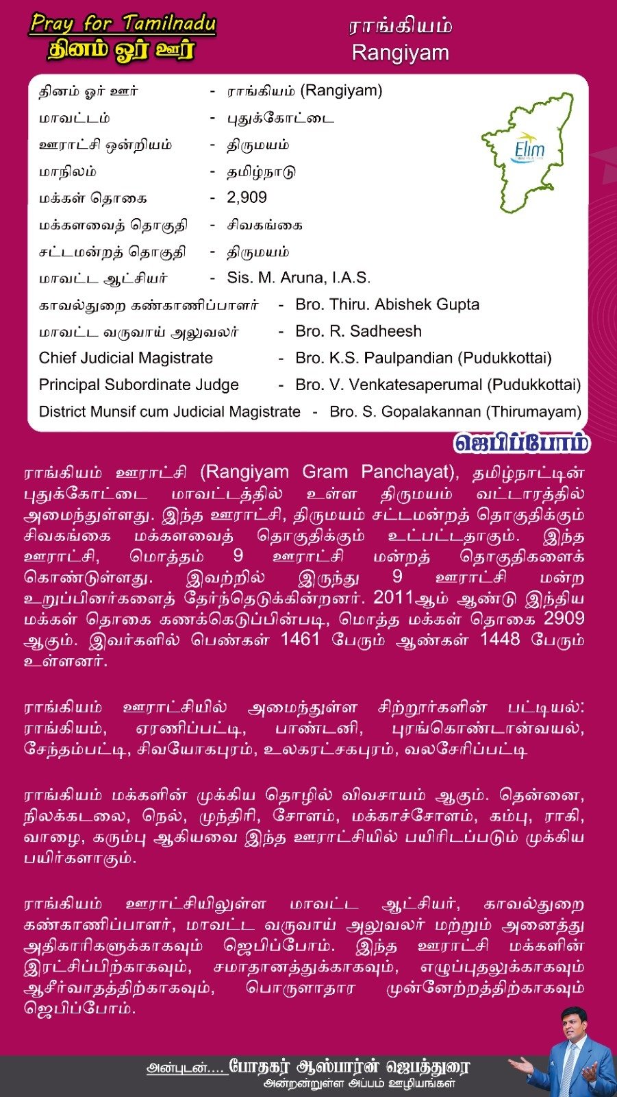 ராங்கியம் ஊராட்சியிலுள்ள மாவட்ட ஆட்சியர், காவல்துறை கண்காணிப்பாளர், மாவட்ட வருவாய் அலுவலர் மற்றும் அனைத்து அதிகாரிகளுக்காகவும் ஜெபிப்போம். இந்த ஊராட்சி மக்களின் இரட்சிப்பிற்காகவும், சமாதானத்துக்காகவும், எழுப்புதலுக்காகவும் ஆசீர்வாதத்திற்காகவும், பொருளாதார முன்னேற்றத்திற்காகவும் ஜெபிப்போம்.