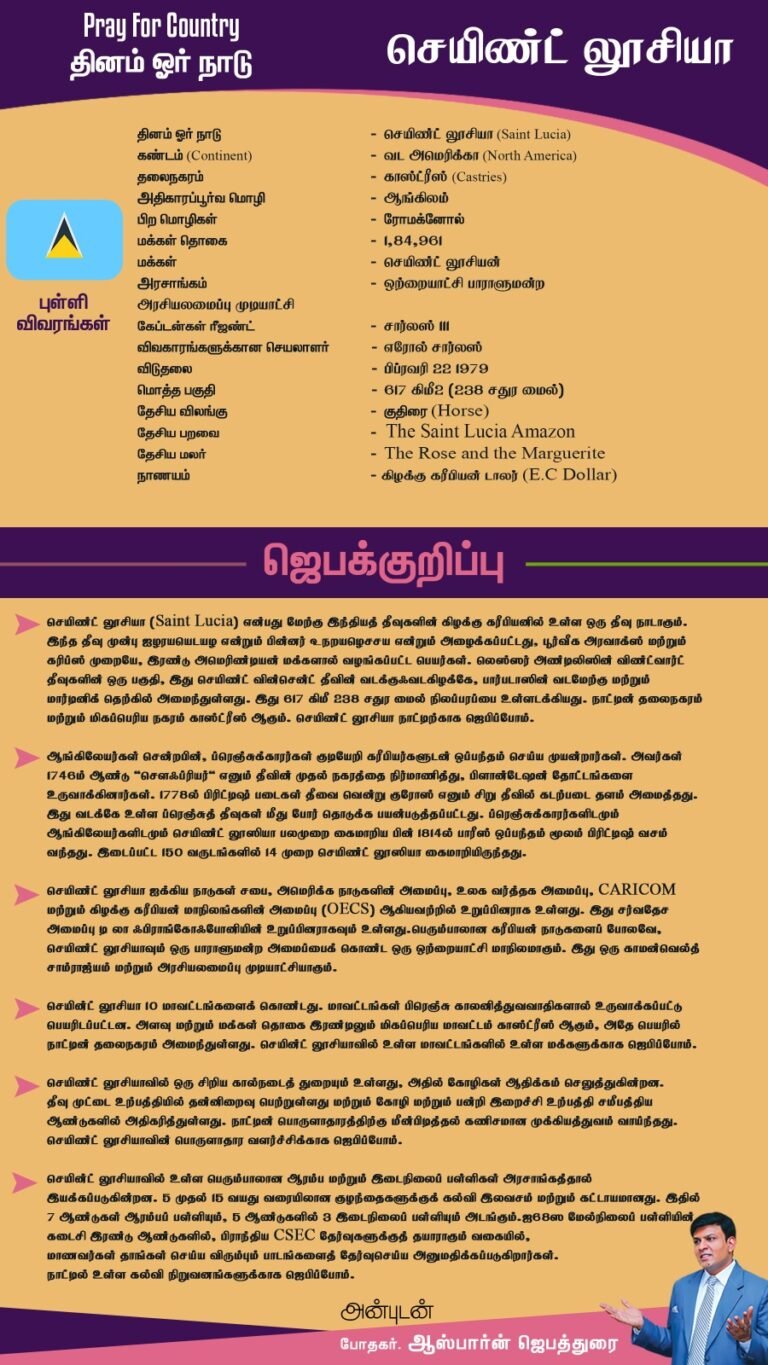 0 Daily Updates தினம் ஓர் நாடு – செயிண்ட் லூசியா (Saint Lucia) – 06/08/23 August 6, 2023 by elimchurchgospel